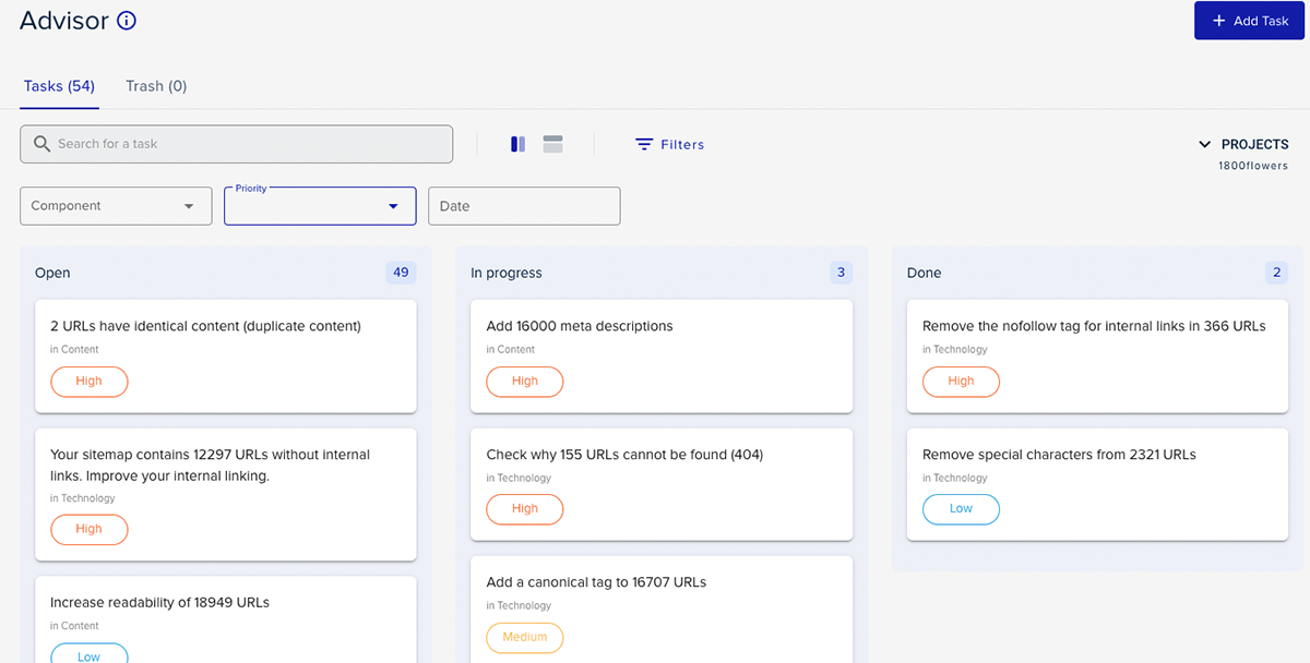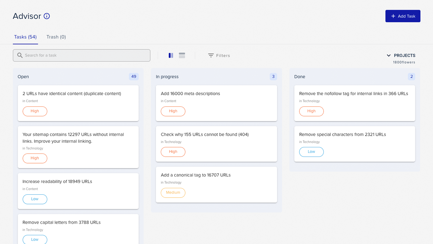 Ten en cuenta que necesitas un Project para que la función de asesor funcione. Además, la mayoría de las tareas del asesor se adaptan al sitio web del proyecto (normalmente el tuyo o el de tu cliente). Si administras más de un sitio web, tendrás que crear un proyecto adicional para cada uno de ellos.